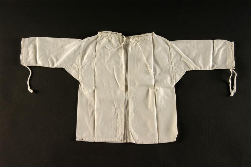 - BeschrijvingKinderblouse van witte katoen met een kanten randje langs de hals. Het blousje kan aan de achterzijde en aan de mouwtjes worden aangenoerd door middel van kleine witte koordjes.