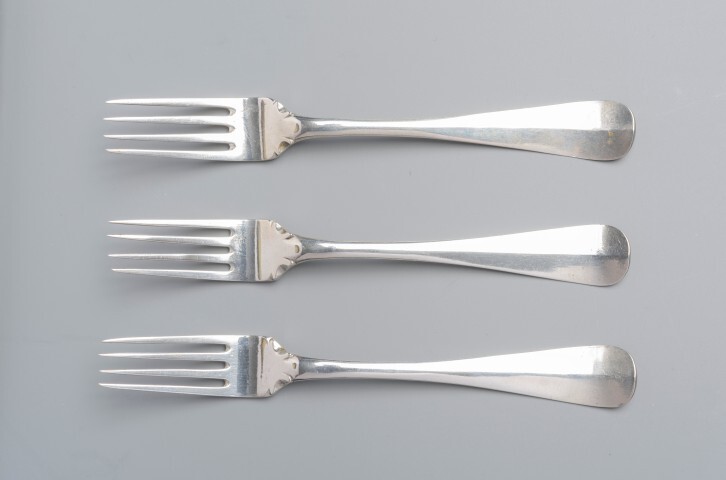 Drie kleine vorkjes van zilver. Versierd met een Haags lofje.