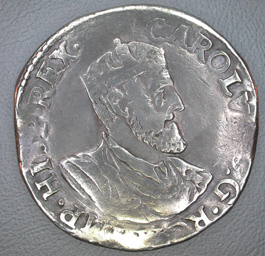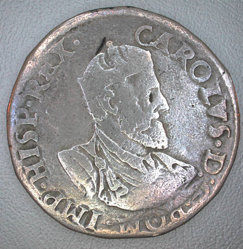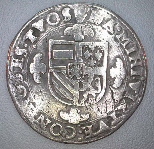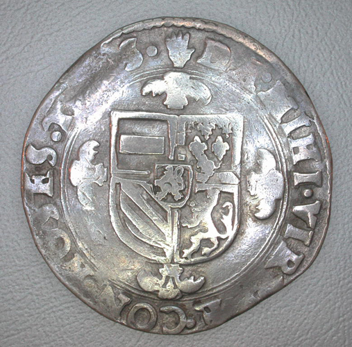 - BeschrijvingVz: binnen een getrokken rand het gekroonde borstbeeld van Karel V naar rechts; omschrift: CAROLVS:D:G:ROM:IMP:HISP.REX, handje Kz: binnen een getrokken rand een gebloemd kruis, beladen met het Oostenrijks-Bour¬gon¬dische wapen; omschrift: DA.MIHI.VIRTVTE.CO.HOST.ES.TVOS