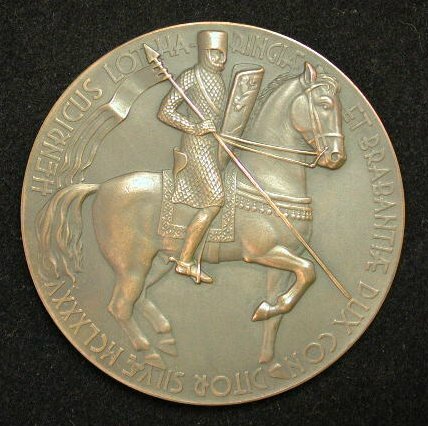 - BeschrijvingPenning uit de penningkist van de Provinciale Griffie van Noord-Brabant. Voorzijde: beeldenaar van Hertog Hendrik in volle wapenuitrusting te paard, met daar omheen tekst. Achterzijde: een grote boom, daarnaast twee kleinere bomen en tekst.