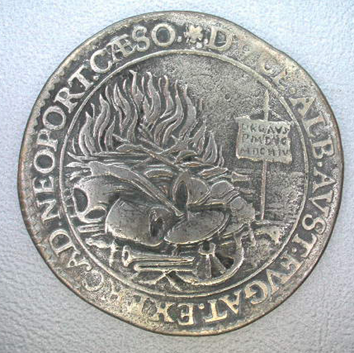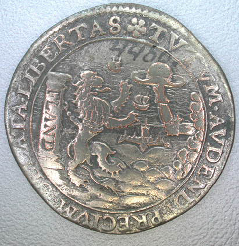 Vz: Binnen een getrokken rand een geharnaste arm, die een vrijheidshoed aanbiedt aan een leeuw die geketend is aan een paal waarop het woord "FLAND". Tussen de getrokken rand en een parelrand het omschrift. Kz: Binnen een getrokken rand een hoop brandend oorlogstuig, met daarnaast een bord met een opschrift. Tussen de getrokken rand en een parelrand het vervolg van het opschrift.