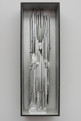 - BeschrijvingDe Heilige Cecilia, patrones der musici, wordt traditioneel afgebeeld spelend op een orgel. In dit beeld is zij zelf van engel tot orgel geworden.