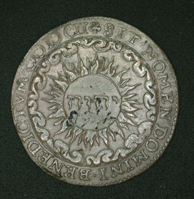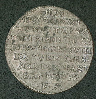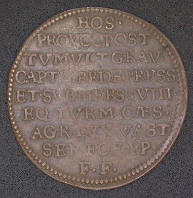 - BeschrijvingVz: Binnen een getrokken rand het woord "Jehova" (in het Hebreeuws) in een stralende zon. Tussen de getrokken rand en een parelrand het omschrift. Kz: In het door een parelrand omgeven veld het opschrift HOS./TROVOC.POST./TVMVLT.GRAV./CAP.TRIRE.DEPRESS./ET.SVBMERS.VIII,EQ.TVRM.CAES./AGR.LVX.VAST/SEN.FOE.PP/F.F.