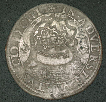 - BeschrijvingVz: Binnen een getrokken rand een afbeelding van de fabel van Aesopus waarin een vos een haan uit een boom lokt. Tussen de getrokken rand en een parelrand het omschrift. Kz: Binnen een getrokken rand de plattegrond van Oostende. Tussen de getrokken rand en een parelrand het omschrift.