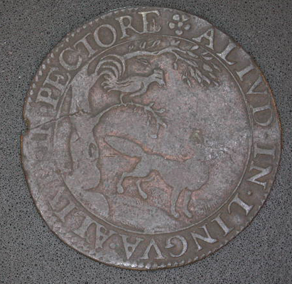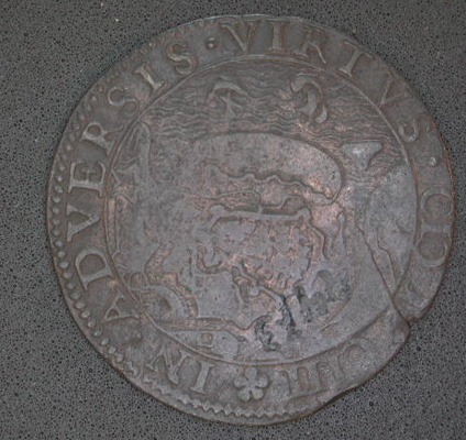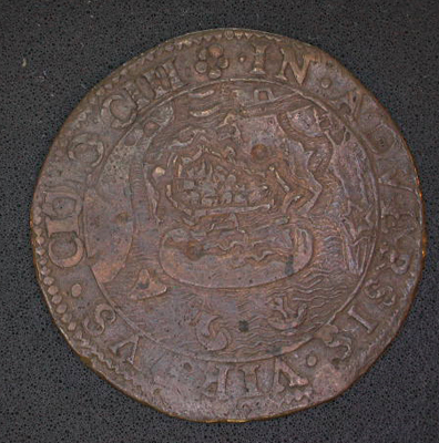 Vz: Een gezicht op de Sluis met galeizen in de haven. In de afsnede het gekroonde wapen van de provincie Utrecht, geflankeerd door ORD - TRA. Tussen de getrokken rand en een parelrand het eerste deel van het omschrift dat op de keerzijde gevolgd wordt. Kz: Een plattegrond van Oostende, en de afsnede MDCIII. Tussen een getrokken rand en een parelrand het vervolg van het omschrift
