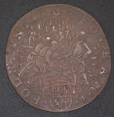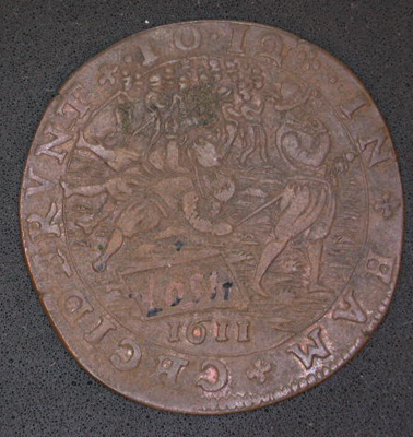 Vz: Binnen een getrokken rand een voorstelling van twee mannen die een kuil graven, terwijl een Spanjaard toekijkt op de achtergrond toeschouwers. In de afsnede het wapen van de Staten van Utrecht. Geflankeerd door het jaartal 16-17. Tussen de getrokken rand en een parelrand het omschrift. Vz: Binnen een getrokken rand een voorstelling van de twee mannen die in de kuil vallen terwijl de Spanjaard wegloopt. In de afsnede het jaartal 1611. Tussen de getrokken rand en een parelrand het omschrift. In 1610 zette een verbond van strenge calvinisten en katholieken, in samenwerking met ontevreden regenten, de door de regenten de dominee,de magistraat van Utrecht af. Op verzoek van de Staten van Utrecht greep Van Oldenbarnevelt in en zond legertroepen met Frederik Hendrik aan het hoofd naar de stad. Onder druk hiervan traden de "factionisten" terug en werd in