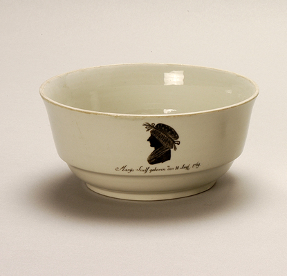 - BeschrijvingSpoelkom vrij wijd en op standring. Op de voorzijde een silhouetportret naar links van een vrouw en het onderschrift: Marya Snels geboren den 10. Augs. 1769. Op de achterzijde: het welvaren van het hof van Holland.