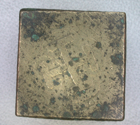 - BeschrijvingVierkant gewichtje in lage broodjesvorm, 0,3 x 1,3 x 1,5 cm, ca. 5 à 10 gram, met aan de ene zijde een krukkenkruis in een vierpas, omgeven door een parelrand (= Portugese Gouden Crusado). Aan de andere zijde een getordeerd zwaard (?) met de letters GDN en het jaartal 1623, het geheel omgeven door een lauwerkrans (=Guilliam de Neve, goudgewichtmaker A'dam)