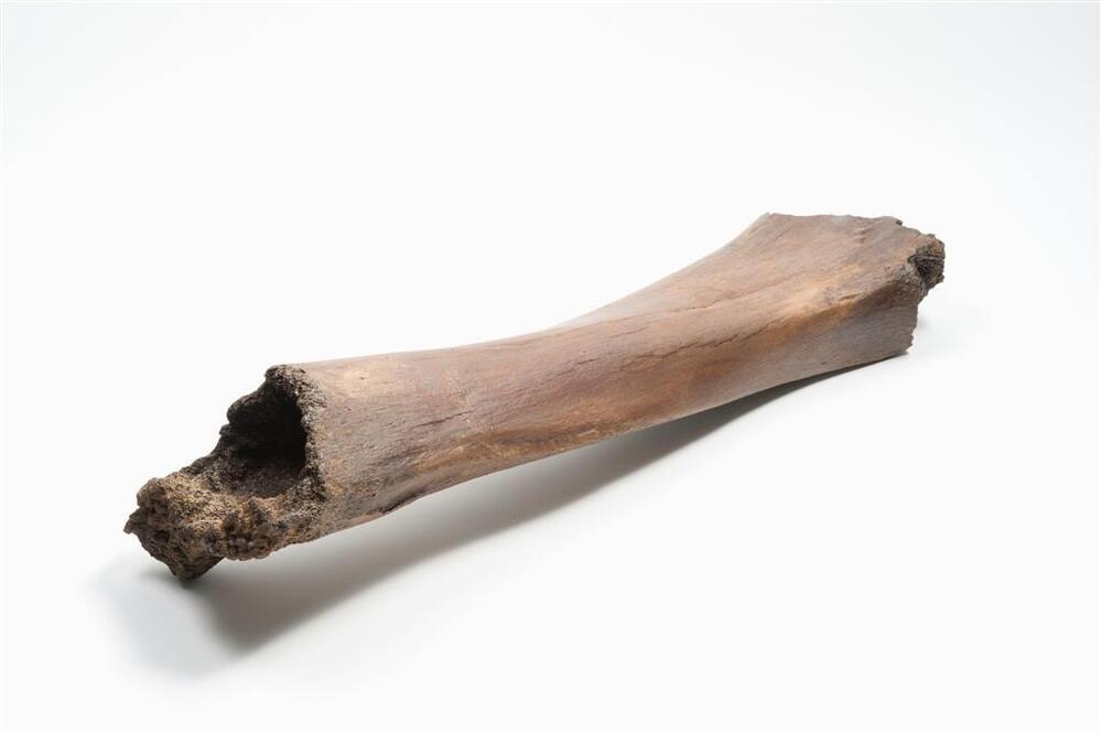 - BeschrijvingLinker dijbeen van een Mammuthus primigenius. Het been is bewerkt en er zijn knaagsporen op te zien.