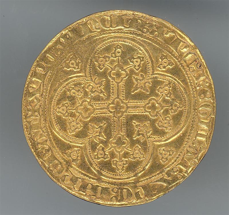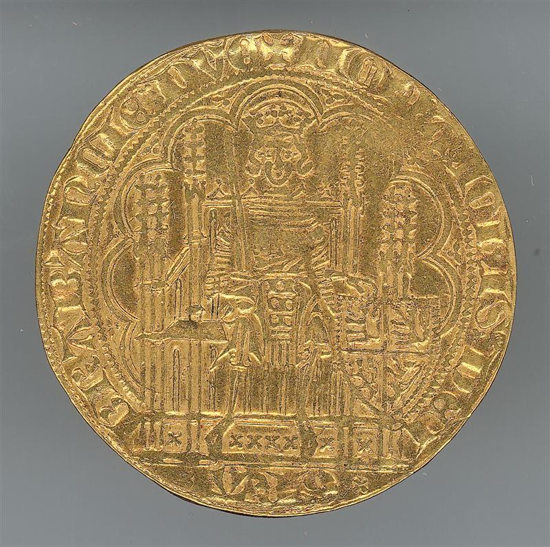 Voorzijde: de hertog, met open kroon, gezeten op een gothische troon.