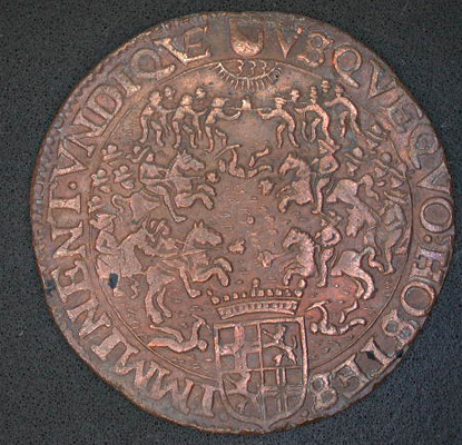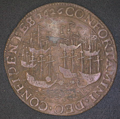 - BeschrijvingVz: Binnen een getrokken rand een ruitergevecht midden onder het gekroonde wapen van de Staten van Utrecht. Daaromheen het omschrift en een parelrand Kz: Binnen een getrokken rand een zeegevecht. Daaromheen het omschrift en een parelrand.