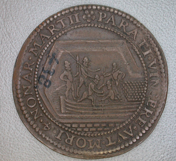 - BeschrijvingVoorzijde: soldaten die uit het turfschip komen binnen een parelrand en een omschrift. Keerzijde: lauwerkrans en daarbinnen een opschrift.