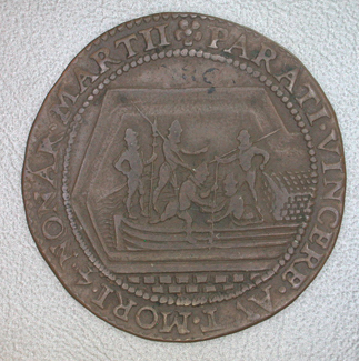 - BeschrijvingVoorzijde: lauwerkrans en daarbinnen een opschrift. Keerzijde: soldaten die uit het turfschip komen binnen een parelrand en een omschrift.