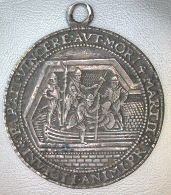 - BeschrijvingVoorzijde: soldaten die uit het turfschip komen binnen een parelrand en een omschrift. Keerzijde: lauwerkrans en daarbinnen een opschrift.