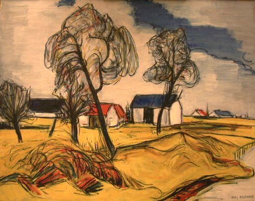 - BeschrijvingLandschap met enkele boerderijen met rode en blauwe daken. Rechts een rivier.