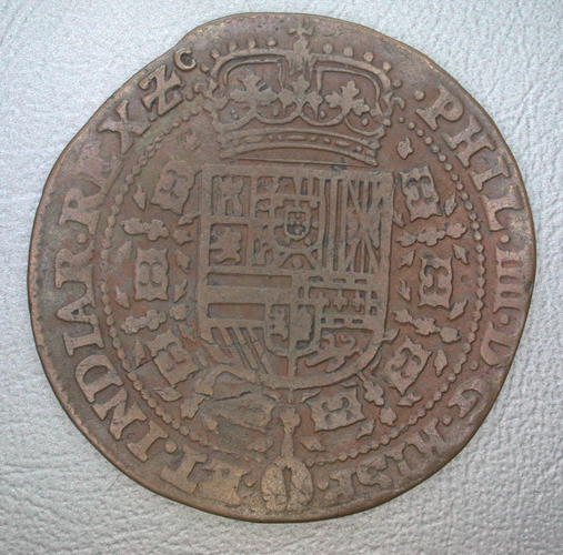 - BeschrijvingVz:binnen een parelrand het gekroonde wapen van Spanje, omhangen met een Gulden Vliesketen; omschrift: .PHIL.IIII.D.G.HISP.-.Et.INDIAR.REX.Zc. Kz:binnen een parelrand een zon tussen de wolken boven een haven; omschrift: HIS.QVOQVE.SVBIEC¬TA/16 kopje 47