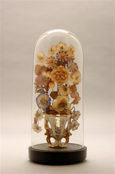 Glazen stolp met daarin een goud beschilderd porseleinen vaasje met bloemen. De stolp staat op drie pootjes.