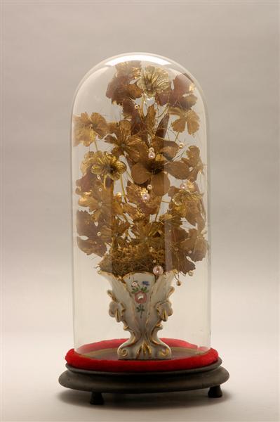 Stolp met wit porseleinen rozenvaasje met bloemen.
