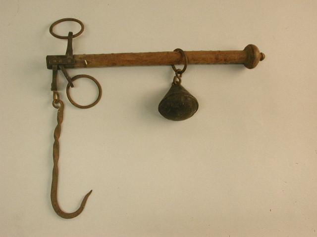 - BeschrijvingHouten balansstok met koperen maatnagels, kop en beugels met ijzeren haak en ringen. Kegelvormig deels? met ijzer gevuld, koperen gewicht met ingeslagen nummer 46, van 435 gram.