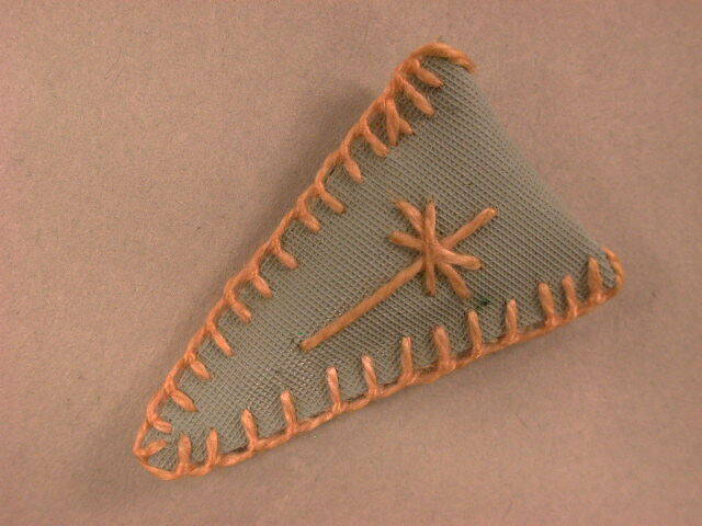 Omhulsel in de vorm van een gelijkbenige driehoek gemaakt van lichtblauw plastic en roze garen.