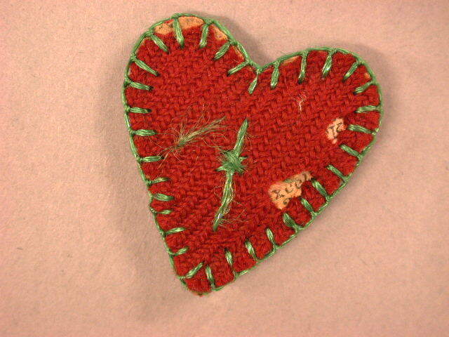 Hartvormige Agnus Dei gemaakt van rode stof en groen garen met deels verdwenen Grieks kruis. Op voorzijde rechts twee motgaatjes.