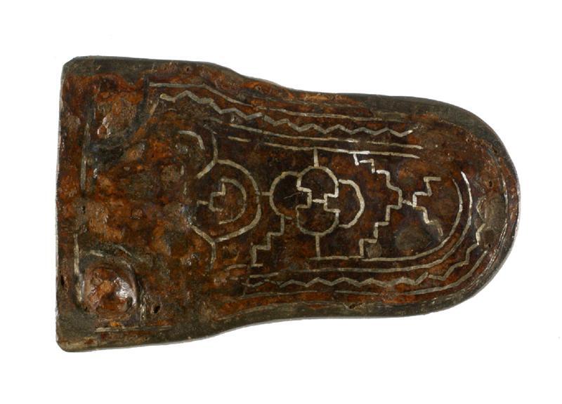 - BeschrijvingRiemtong met een rechte basis gedecoreerd met een gedamasceerd geometrisch patroon.
