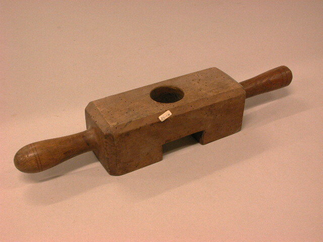Houten schroefblok voor (linnen?) pers. In het midden een gat. Een van de handgrepen vervangen.