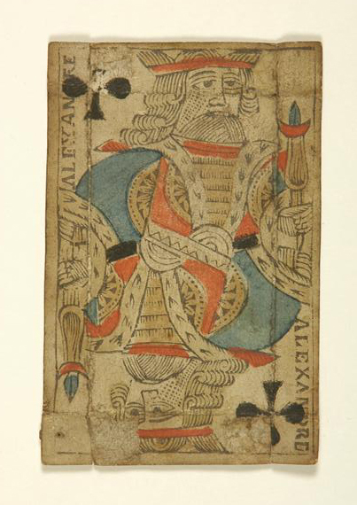 - BeschrijvingKlaverheer met bijschrift: ALEXANDRE. Op de achterzijde gestippeld motief van lijnen en sterren.
