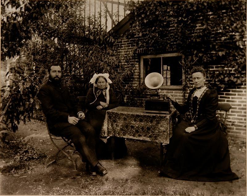 - Beschrijving5. Thijs van de Wolk met vrouw en schoonmoeder. Op tafel een koffergrammofoon, ca. 1909