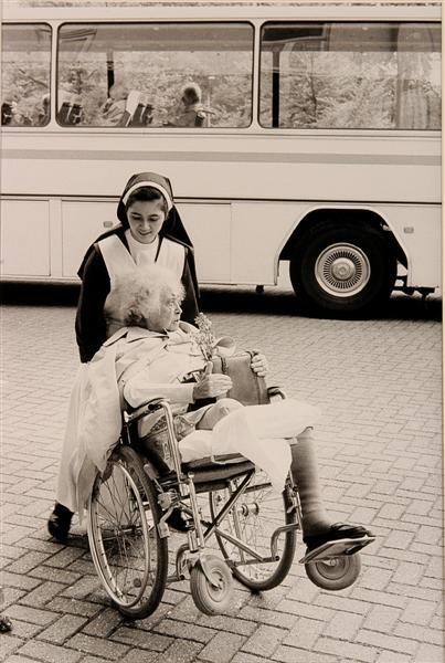 Een van de Zusters Carmelitessen van het goddelijk Hart van Jezus brengt een bejaarde terug naar de bus, Vogelenzang
