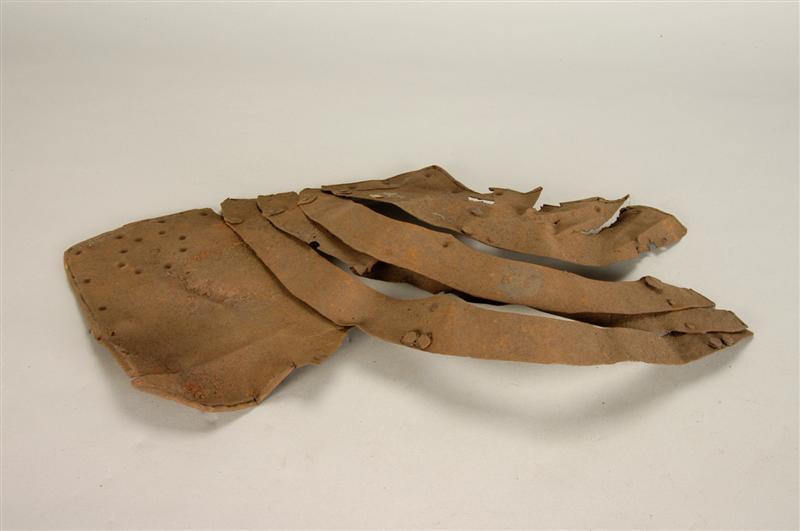 Fragment van een borstharnas bestaande uit aaneengeklonken repen ijzer.