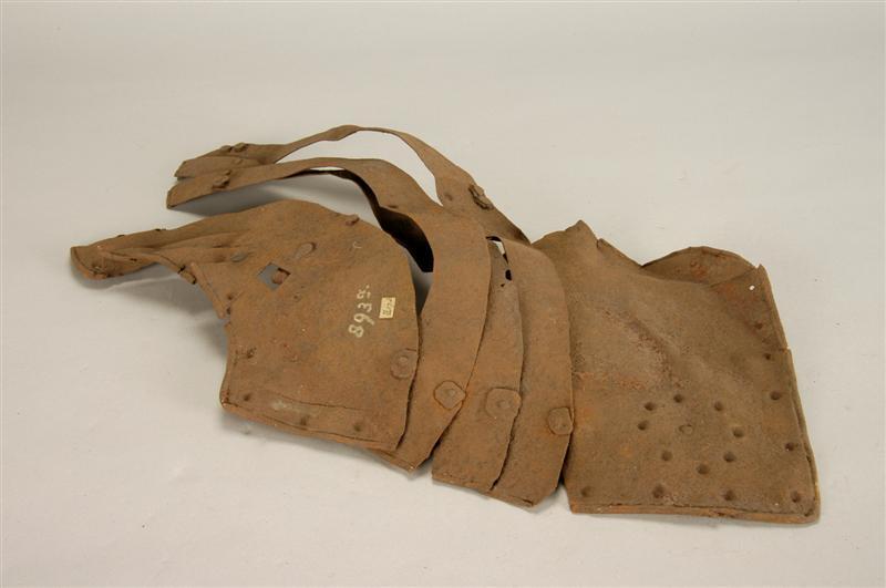 Fragment van een borstharnas bestaande uit aaneengeklonken repen ijzer.