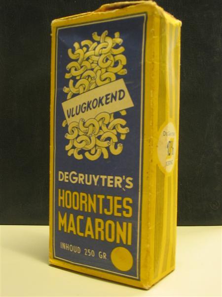 - BeschrijvingKartonnen verpakking van vlugkokende hoorntjes macaroni, 250 gram. Op de voorkant staan macaroniboogjes. De verpakking is blauw met geel. Op de achterkant staan de kookvoorschriften. Het pak is gevuld en gesloten.
