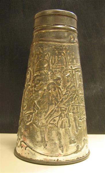 - BeschrijvingMetalen tapstoelopende bus met draaibaar strooideksel om bijvoorbeeld hagelslag uit te strooien. Op het blik staat een afbeelding van een mevrouw in een draagkoets met lakeien erop. De bus is gevuld.