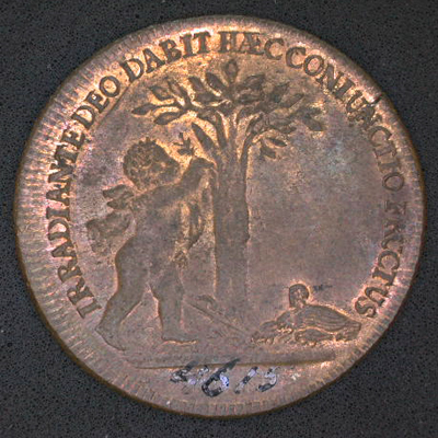 - BeschrijvingVz: De elkaar overschrijdende gelauwerde borstbeelden van Karel II en Maria Anna van de Palts naar rechts. Daaromheen het omschrift en een parelrand. Kz: Een Amor ent een takje op een boom. Daaromheen het omschrift en een parelrand.