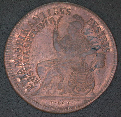 - BeschrijvingVz: Borstbeeld van Karel II van Spanje naar rechts Daaromheen het omschrift. Kz: Zittende soldaat met twee palmtakken in de ene en het wapen van Oostenrijk in de andere hand. Voor hem het opschrift AVSTRA SPERAVIT. In de afsnede de signatuur van de medailleur. Om het geheel het omschrift.