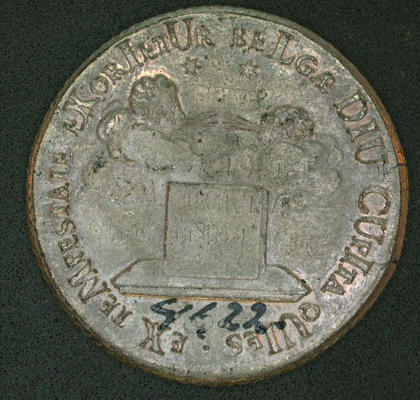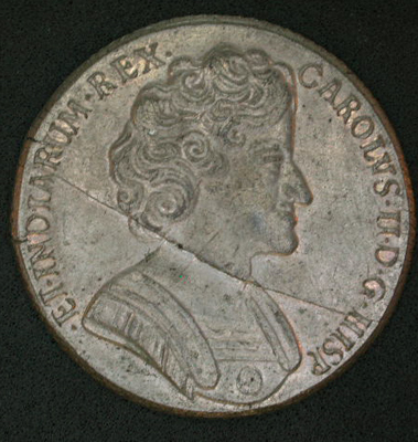 - BeschrijvingVz: Borstbeeld van Karel II naar rechts. Tussen twee getrokken randen het omschrift.