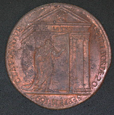Vz:De keurvorst van Beieren sluit de deur van de Janustempel. Daaromheen het omschrift. Kz:De Spaanse en de Beierse leeuw, elk met een poot rustend op hun respectievelijke wapenschild,trekken een zegelkar. Waarin de Vrede is gezeten. Blanco afsnede. Boven de voorstelling een opschrift De Janustempel op het forum Romanum te Rome had de vorm van een poortdoorgang. Deze poort mocht slechts gesloten worden wanneer in het gehele Romeinse rijk vrede heerste.