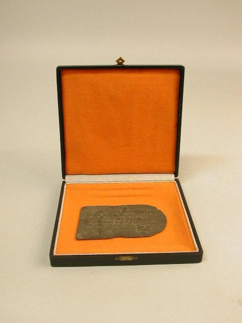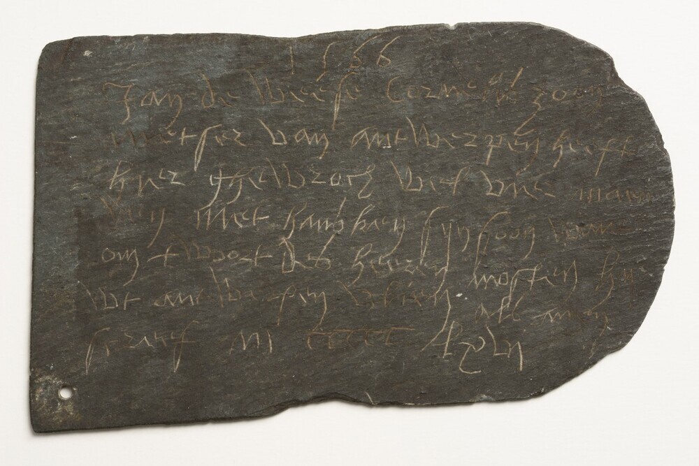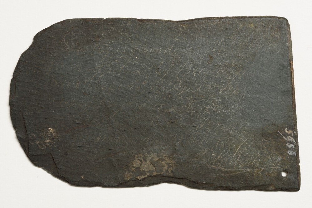 Rechthoekige lei, aan één der korte zijden afgerond met opschrift op voor- en keerzijde.