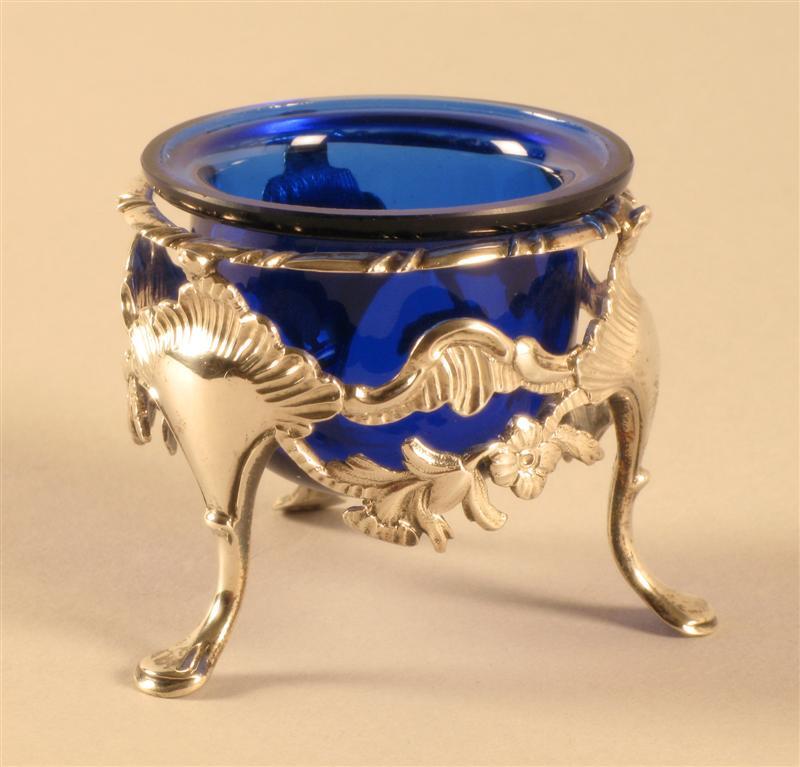 - BeschrijvingZoutvaatje met asymetrische versiering in de vorm van bloemen, bladeren en rocailles. Met blauw glazen binnenbakje.