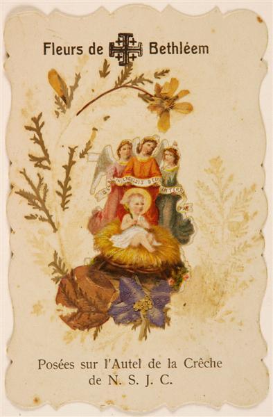 - BeschrijvingHet Christuskind zit in een kribbe, omgeven door een engelenschare, die een tekstbanderolle bij zich hebben met de tekst: 'in exculsis deo in terra pars'. Rond dit plaatje zijn echte bloempjes geplakt die voor een deel reeds verdwenen zijn. Tekst boven: 'Fleurs de Bethléem'. Tekst onder: 'Posées sur l'Antel de la Crêche / de N.S.J.C.'.