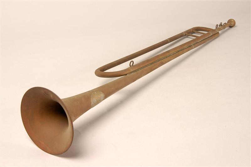 - BeschrijvingBazuin met een winding en los inschuifbaar mondstuk dat met een kettinkje aan de buis vastzit. Op de beker een metalen plaatje met een trompettist, tussen 5 engeltjes en staande op een wereldbol. Boven hem: SOLIST en WETTING GEDEPONEERD. Onder hem: "J. Ansing & Co. Zwolle"
