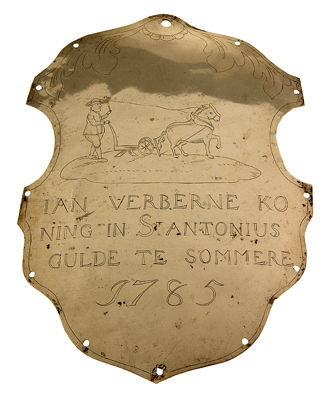 Schild met afbeelding van een man met een ploeg. Ploeg wordt getrokken door twee paarden (slechts 4 benen afgebeeld). Daaronder inschrift: "IAN VERBERNE K/NING IN ST ANTONIUS/GULDE TE SOMMERE/1785" Schild heeft onregelmatige contouren rondom zijn langs de rand gaatjes aangebracht, waarmee schild langs de vest vastgezet kan worden. Langs de rand gegraveerde decoratie met lofwerk.