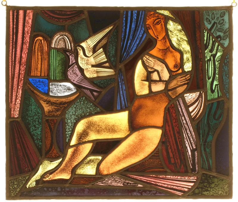 - BeschrijvingGlas-in-lood raam waarop een vrouw te zien is bij een fonteintje met twee vogels.