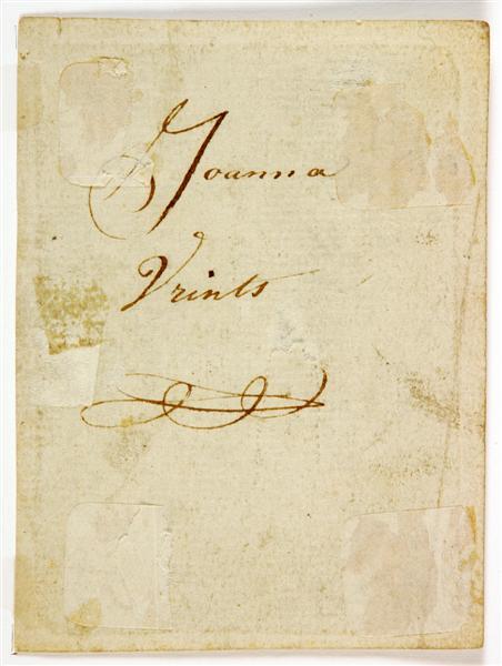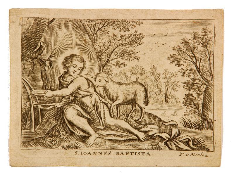 Johannes de Doper als kind, zittend in een landschap. In de linkerhand houdt hij een bakje vast dat hij met water vult. Bij hem staat een lam dat met de linker voorpoot het linker dijbeen van Johannes de Doper raakt. In de rechterhand heeft Johannes een herdersstaf vast. Het lam is een verwijzing naar het Lam Gods en het gebaar van de Johannes die in een schaal water opvangt, moet als een parallel worden gezien voor de jaren later volgende doop van Christus aan de oever van de Jordaan. Bovendien kan de voorstelling van deze devotieprent als een variant worden beschouwd van de plaatjes waarop Johannes en Jezus samen als spelende kinderen zijn afgebeeld.
