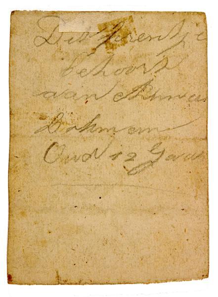 Annuntiatie aan Mariai. De tekst luidt: "GHEBEDT / O Maria noyt volpresen / waeren spiegel van de deught / Door de blydschap op geresen / In uw ziel en soete vreugd / Als den Enghel u quam groeten / Om de Moeder Godts te syn / wilt door uw gebed versoeten / Al mijn droeve smert en pyn / Geeft dat myne ziel mag wesen / Eene woon-plaets van den Heer / Die ons wonden heeft genesen / Door syn bloed en liefde teer / Amen".