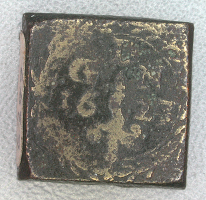 - BeschrijvingEen vierkant plat muntgewichtje, 0,2 x 1,9 x 1,9 cm, ca. 5 gram met aan een zijde in een Koggeschip in een cirkel (Nobel?).