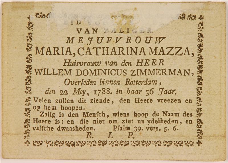 Doodsprent van Maria Catharina Mazza (1752-1788). Voorstelling: de aartsengel Michael strijdt tegen duivelse creaturen. De engel wordt bijgestaan door pijlschietende putti. Michael strijdt voor een dode ziel. Op de achtergrond bevinden zich een brandend schip en een brandend kasteel. De tekst boven luidt: "SED LIBERA NOS A MALO, AMEN". De tekst onder luidt: "Liberavit me Dominus ab omni opere malo; et salvum faciet in regnum suum coleste, cue gloria in / Seccula Secculorum / Timot.2.cap.4.". Symbolische betekenis van de voorstelling: een zg. psychomachia: strijd tussen deugden en ondeugden.
