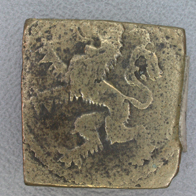 - BeschrijvingVierkant gewichtje in broodjesvorm met op de voorzijde rond een vierspakig rad de 4 britse koningswapens (Kloksgewijs: Engeland/Wales-Schotland-Frankrijk-Ierland), gescheiden door 4 scepters en omgeven door parelrand. Op de achterzijde een niet te identificeren gevierendeeld (?) wapen (?) (vgl. 9667 b5)