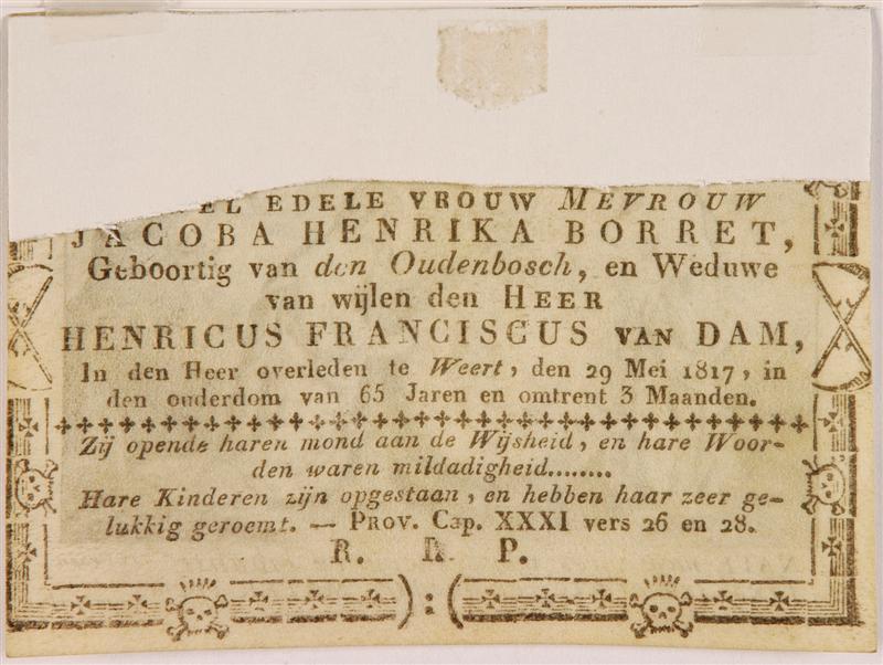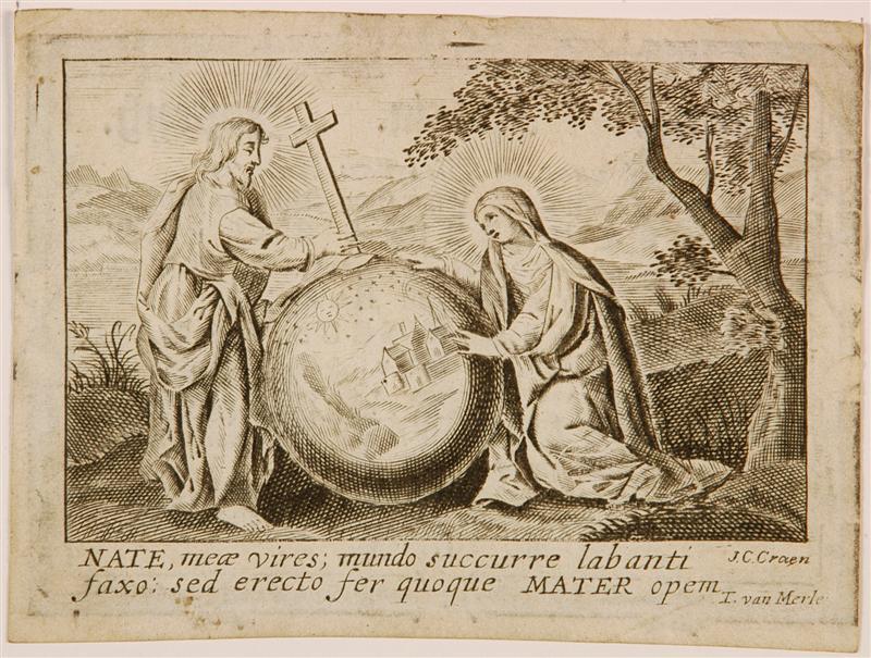 Doodsprent van Jacoba Henrika Borret (1752-1817). Voorstelling: Maria en Christus bevinden zich in een landschap. Tussen hen in ligt een grote globe. Christus plant een kruis op de globe. Deze voorstelling gaat terug op een middeleeuwse legende, waarin Christus aan zijn moeder vraagt zichzelf nooit af te keren van de nieuw opgerichte wereld. De tekst luidt: "NATE, meae vires; mundo seccurre labanti / faxo: sed erecto fer quoque MATER opem".